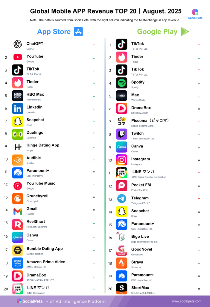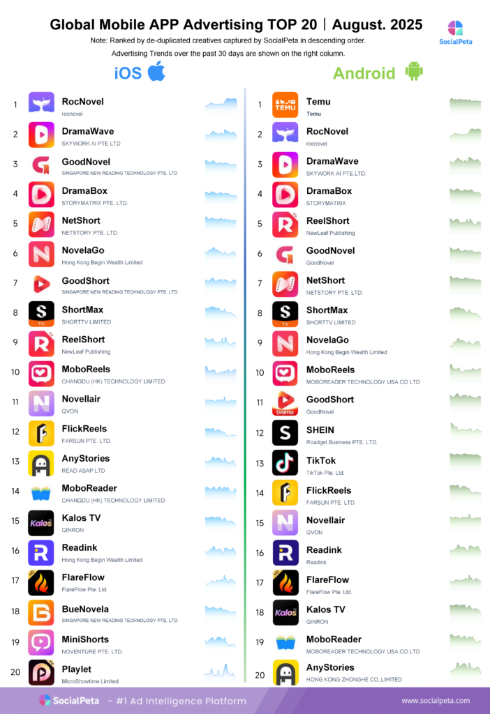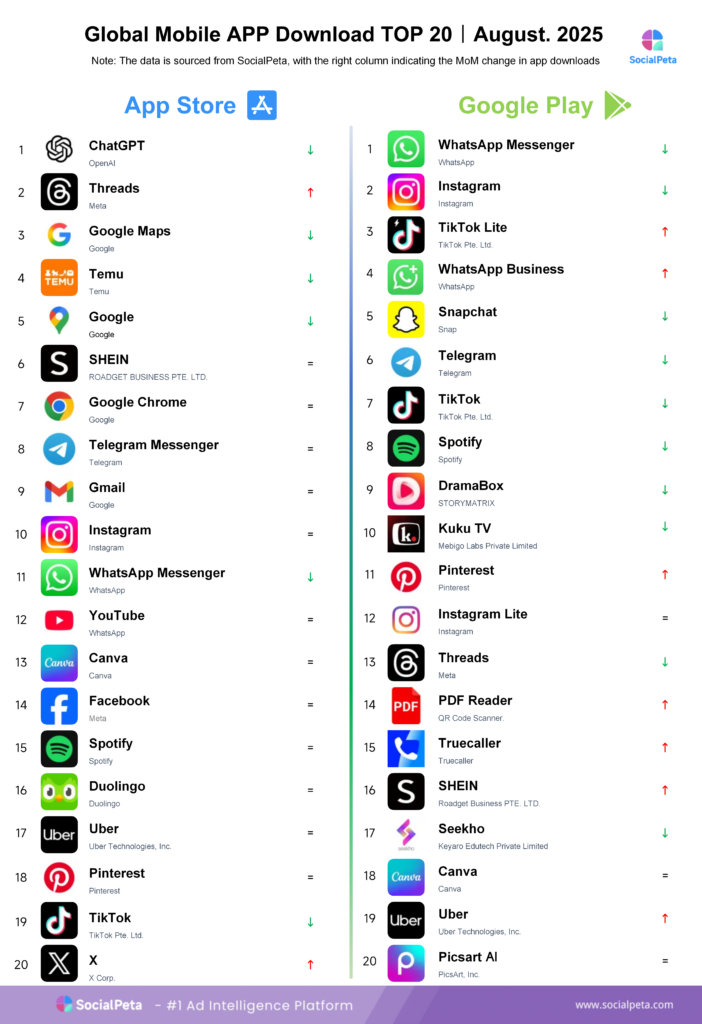 The above are insights into global mobile App launches in August 2025, as well as mobile App revenue and download situations across both the App Store and Google Play. For more mobile marketing data, please visit www.socialpeta.com.