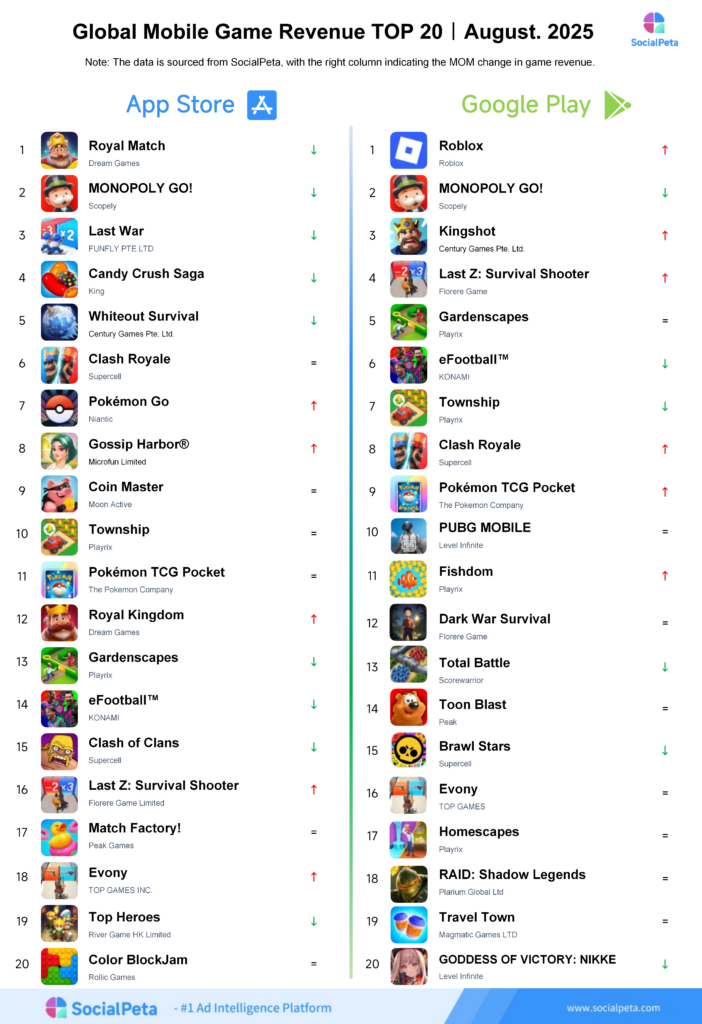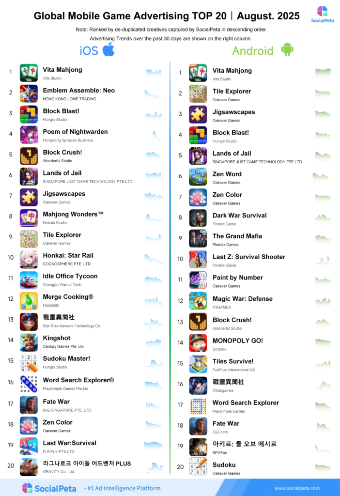 The above are insights into global mobile game launches in August 2025, as well as mobile game revenue and download situations across both the App Store and Google Play. For more mobile marketing data, please visit www.socialpeta.com.
