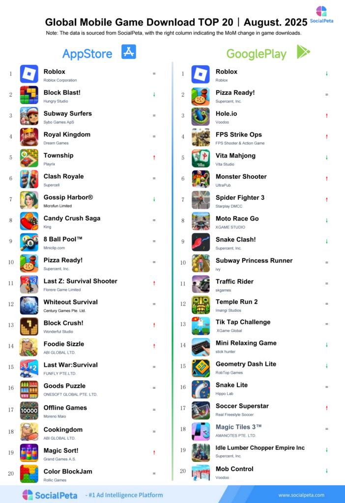 SocialPeta sorted out the top 20 global mobile games by advertising, revenue, and download in August 2025, hoping to be of assistance to more people in the mobile app industry who are trying to understand the changing trends of the global mobile market.