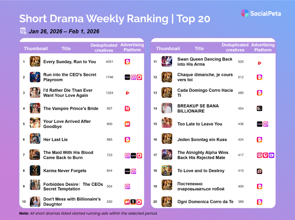 For a deeper breakdown of how leading studios translate storylines into high-performing campaigns, explore SocialPeta’s short drama ad creatives analysis, where we examine creative formats, messaging hooks, and promotional strategies behind top-ranking titles.