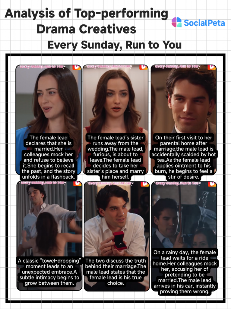 Next, we briefly break down this high-performing creative. The ad starts with the heroine announcing she is married, then shifts into a flashback revealing she married in her sister’s place.The middle sections use light everyday moments to build the relationship, such as visiting family, small misunderstandings, and rainy-day scenes. These relatable details help create empathy and keep the tone sweet and grounded.