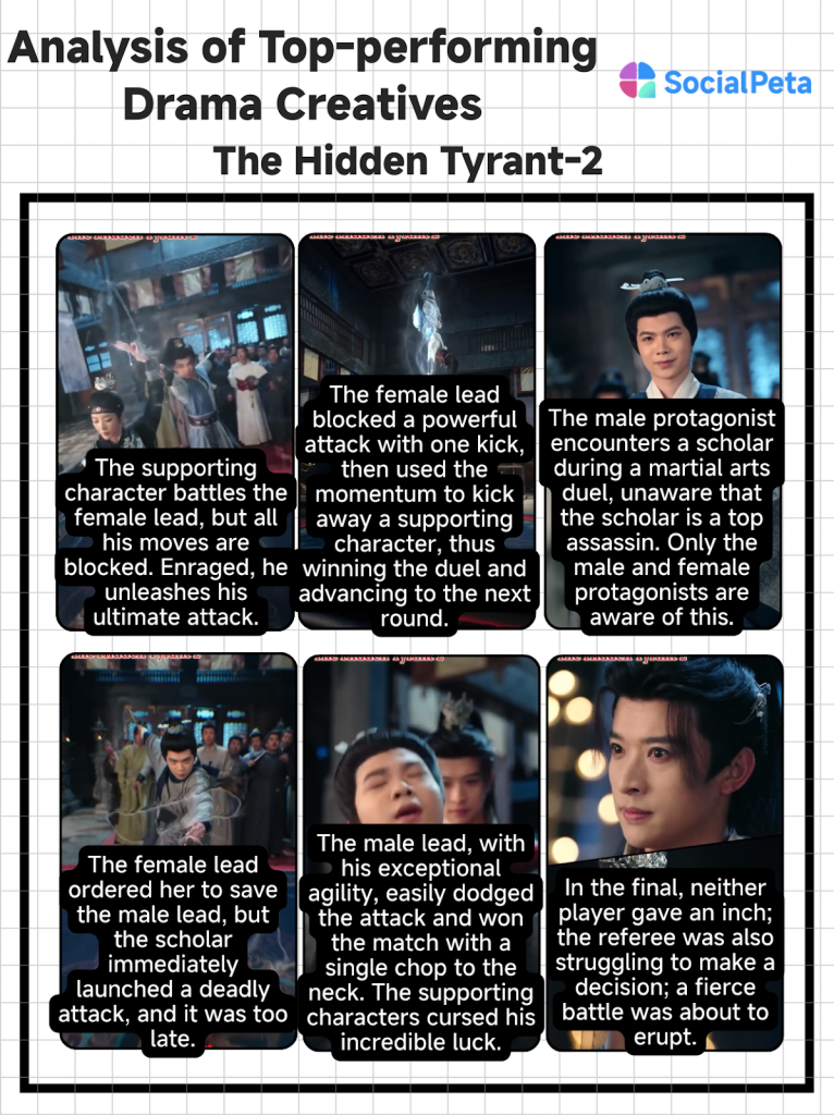 The creative centers on a strong female lead, a contrasting male lead, and a climactic showdown. It opens by showcasing the female lead’s dominance in a martial arts competition, then builds intrigue with the male lead—a playboy who unexpectedly competes. The middle highlights his iconic “playing dumb” move as he swiftly defeats a top assassin, boosting audience satisfaction. The final showdown leaves their conflict unresolved, emphasizing hidden power and intense duels to maximize male audience engagement.