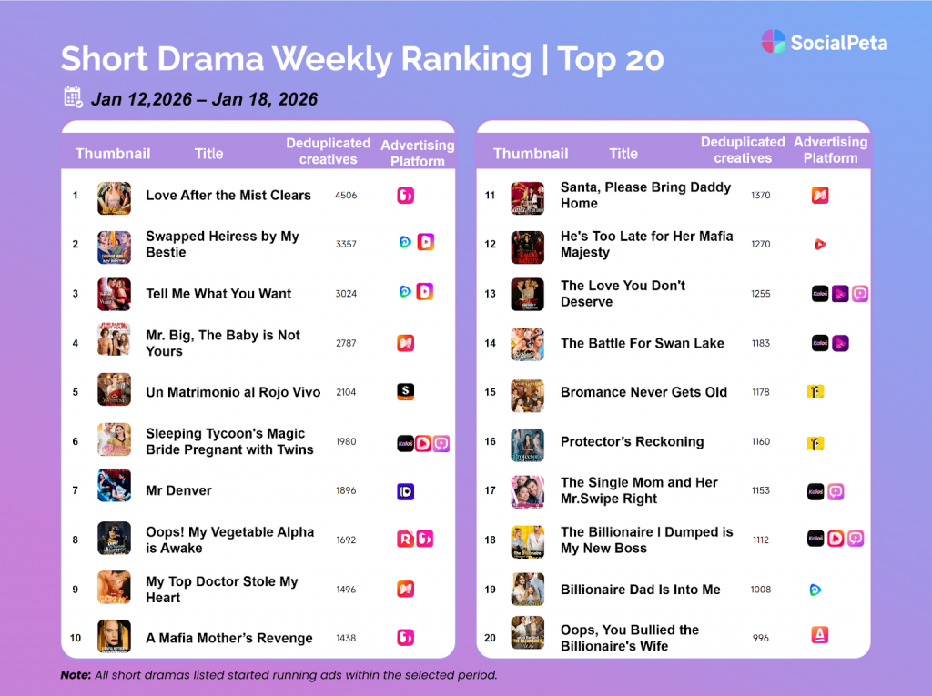 For a deeper breakdown of how leading studios translate storylines into high-performing campaigns, explore SocialPeta’s short drama ad creatives analysis, where we examine creative formats, messaging hooks, and promotional strategies behind top-ranking titles.