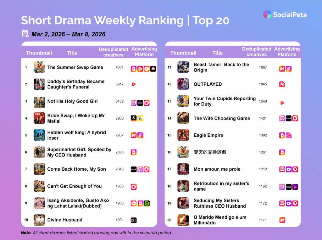 For a deeper breakdown of how leading studios translate storylines into high-performing campaigns, explore SocialPeta’s short drama ad creatives analysis, where we examine creative formats, messaging hooks, and promotional strategies behind top-ranking titles.