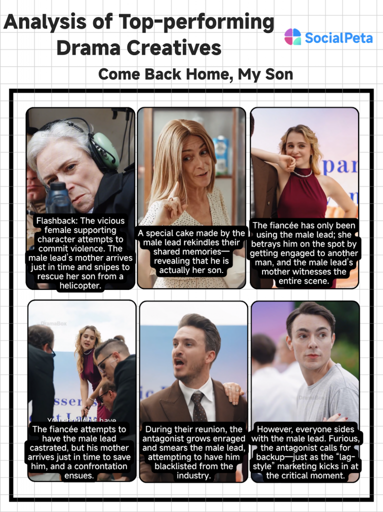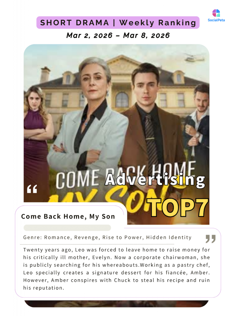 This week’s seventh-ranked short drama, Come Back Home, My Son, tells the story of a CEO mother searching for her lost son over 20 years. After deduplication, around 2.05K promotional materials were released during the period, with an estimated reach of 14.05 million. The drama is primarily promoted on DramaBox, Kalos TV, and Minishorts.