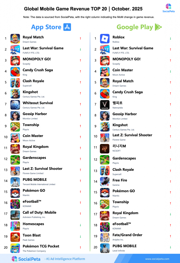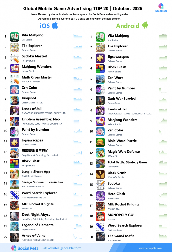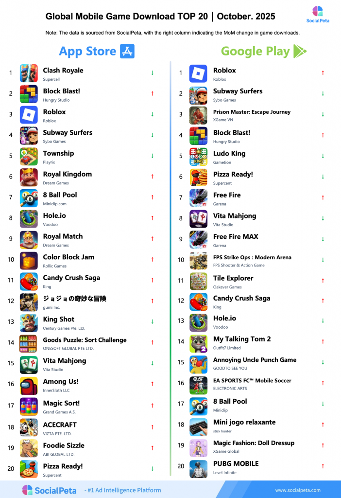 The above are insights into global mobile game launches in October 2025, as well as mobile game revenue and download situations across both the App Store and Google Play. For more mobile marketing data, please visit www.socialpeta.com.