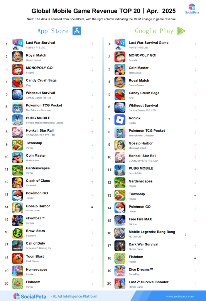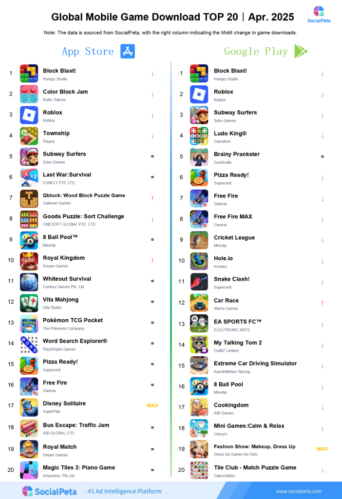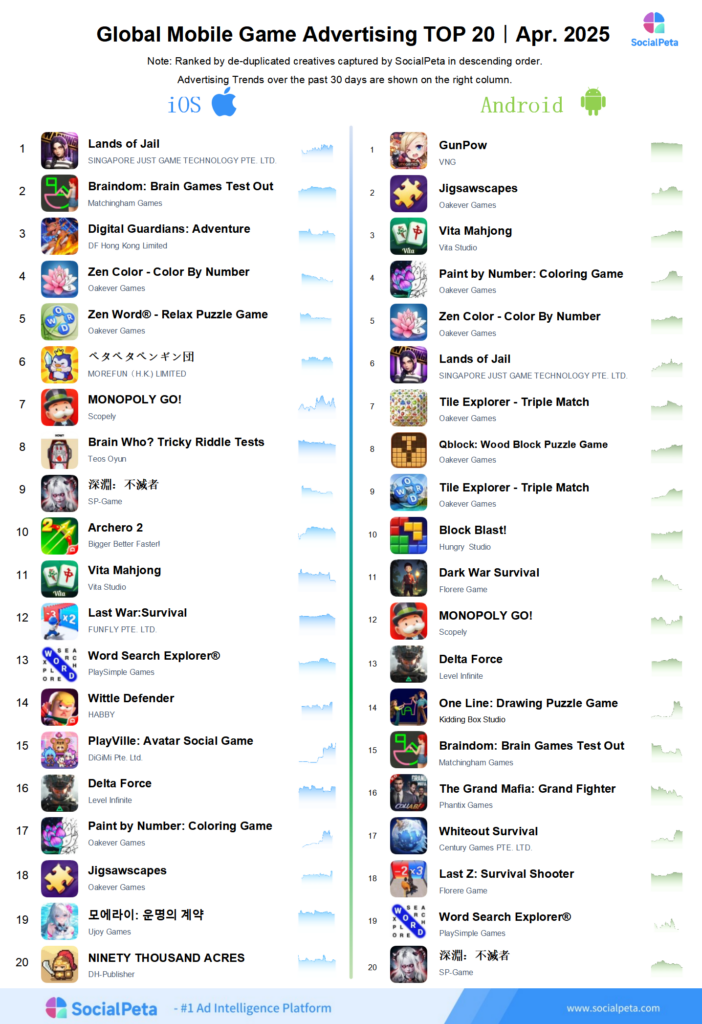 This concludes the global mobile game advertising insights for April 2025, along with the revenue and download data for mobile games on both the App Store and Google Play. For more mobile marketing data, please visit www.socialpeta.com.
