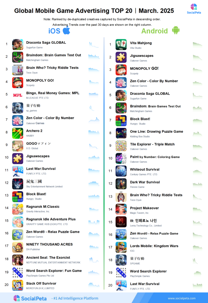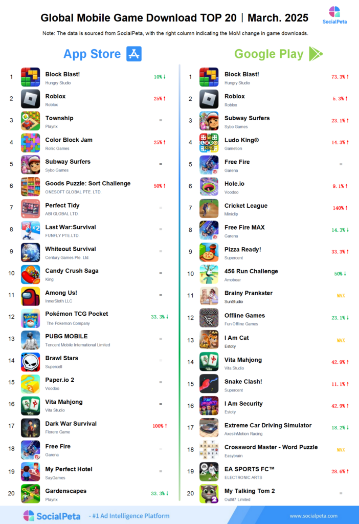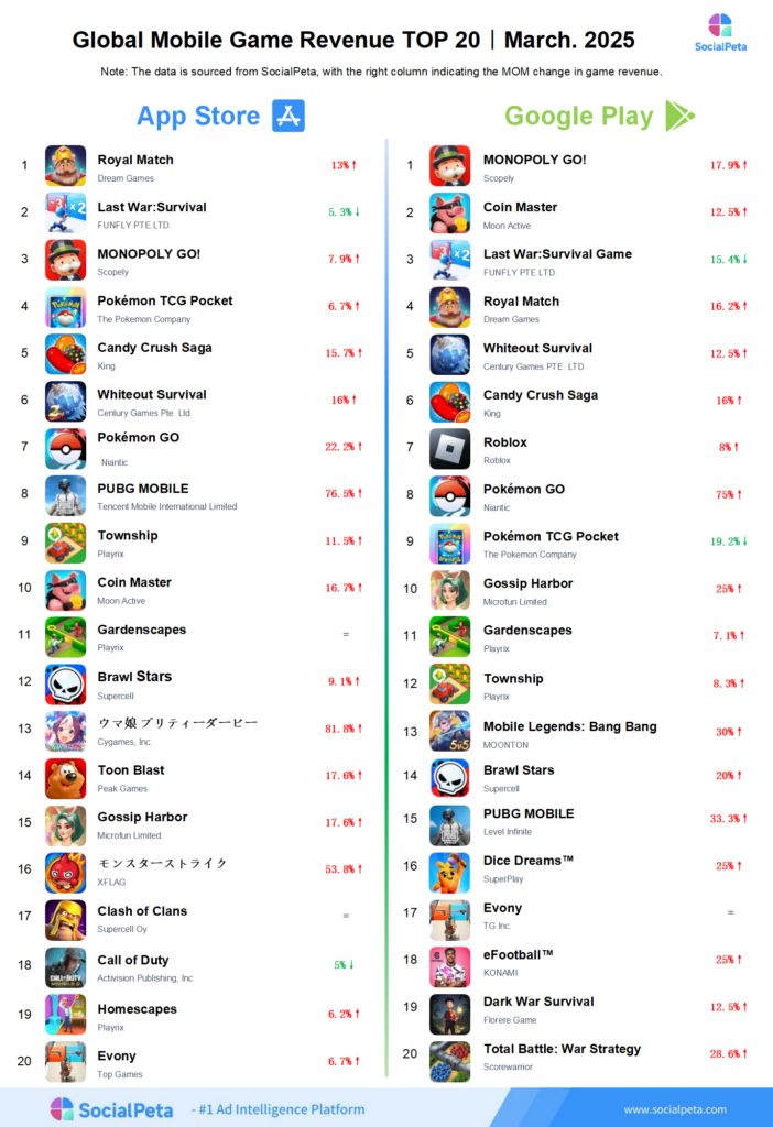SocialPeta sorted out the top 20 global mobile games by advertising, revenue, and downloads in March 2025, hoping to be of assistance to more people in the mobile app industry who are trying to understand the changing trends of the global mobile market.