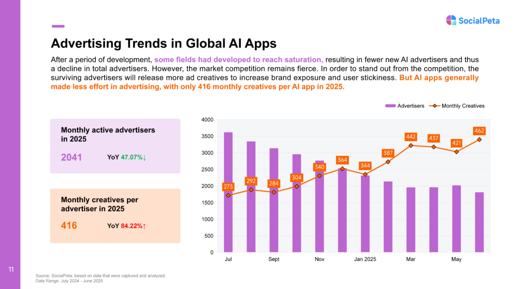 In the first half of 2025, the AIGC mobile app market showed a striking trend: while the number of active advertisers declined, ad creative investment surged. This shift signals a move from broad expansion to deeper engagement in existing markets, with marketing strategies becoming increasingly sophisticated, data-driven, and precisely targeted.