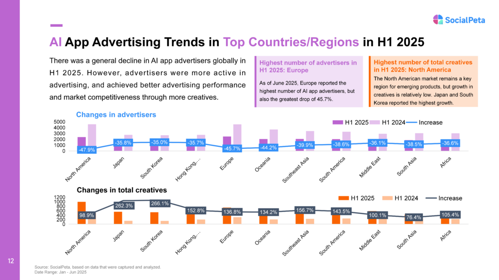 - Japan and South Korea stood out with creative volumes surging 262.3% and 266.1% year-on-year, respectively, positioning them as high-potential growth markets.