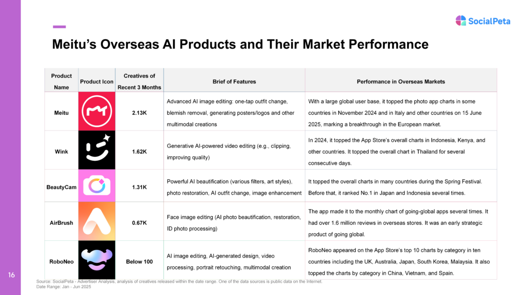 Globally, Meitu’s product portfolio has delivered impressive results. With multimodal editing functions such as AI one-click outfit changes and AI poster generation, Meitu reached the #1 spot in the photography category in markets like Italy in June 2025—a major breakthrough in Europe.