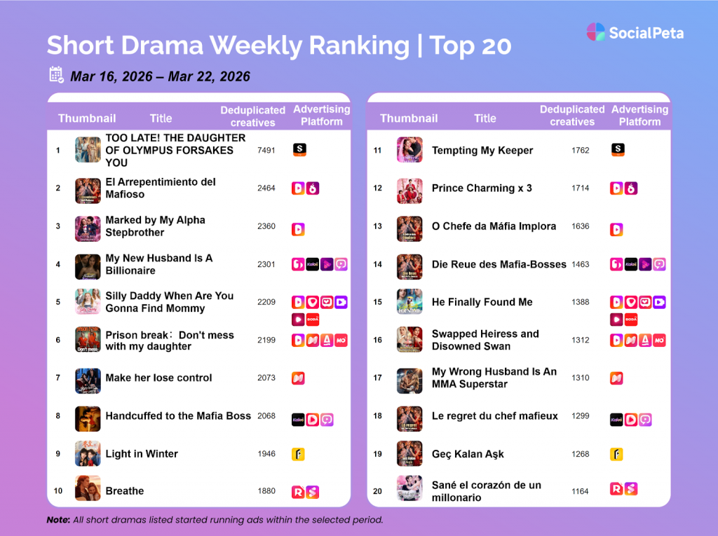For a deeper breakdown of how leading studios translate storylines into high-performing campaigns, explore SocialPeta’s short drama ad creatives analysis, where we examine creative formats, messaging hooks, and promotional strategies behind top-ranking titles.