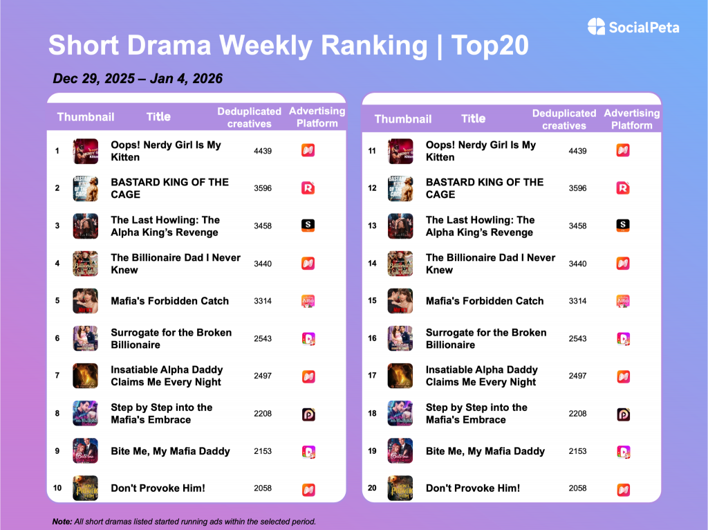 For a deeper breakdown of how leading studios translate storylines into high-performing campaigns, explore SocialPeta’s short drama ad creatives analysis, where we examine creative formats, messaging hooks, and promotional strategies behind top-ranking titles.